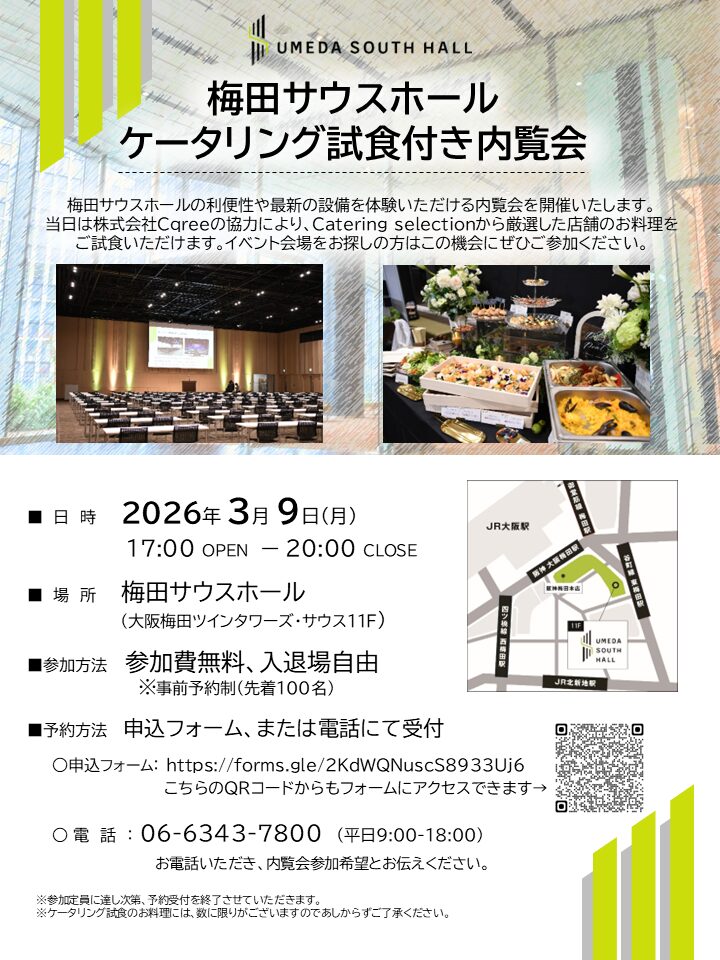 【主催者様向け】3/9(月) 梅田サウスホール ケータリング試食付き内覧会の開催について