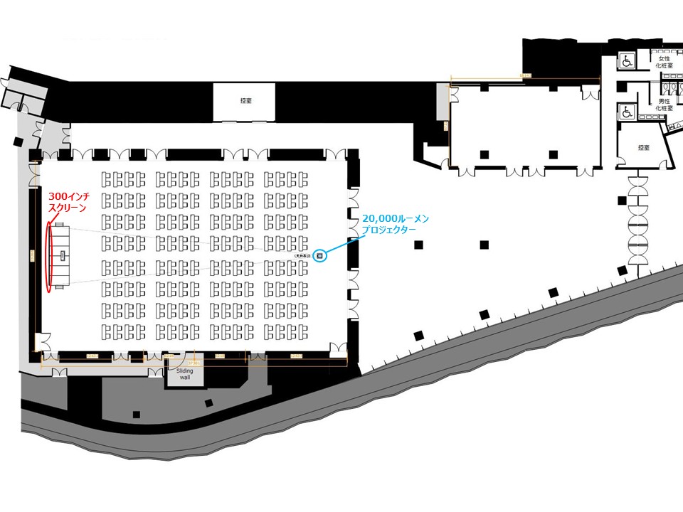 梅田サウスホールには300インチスクリーンと20,000ルーメン プロジェクターを常設でご用意しております。