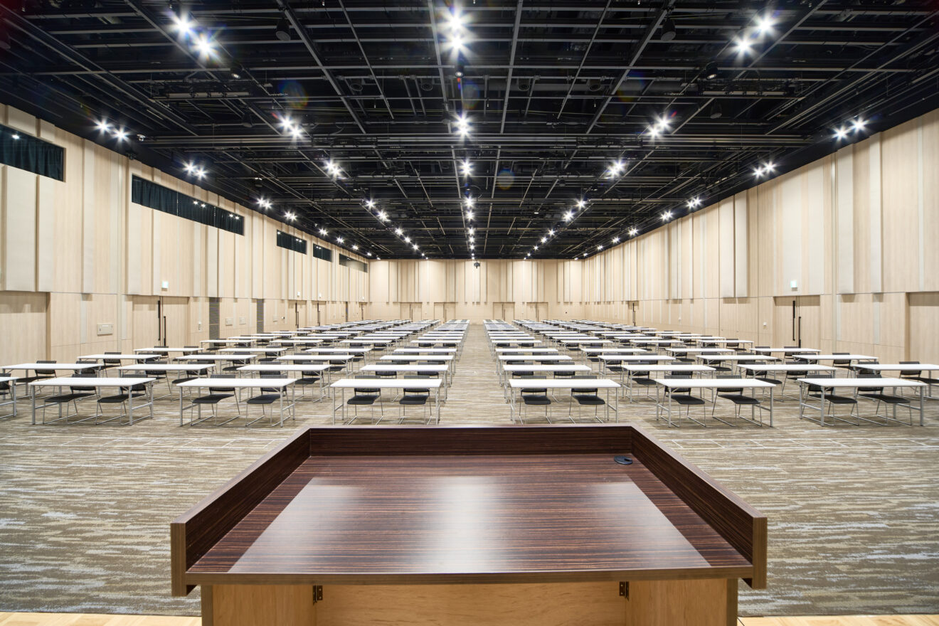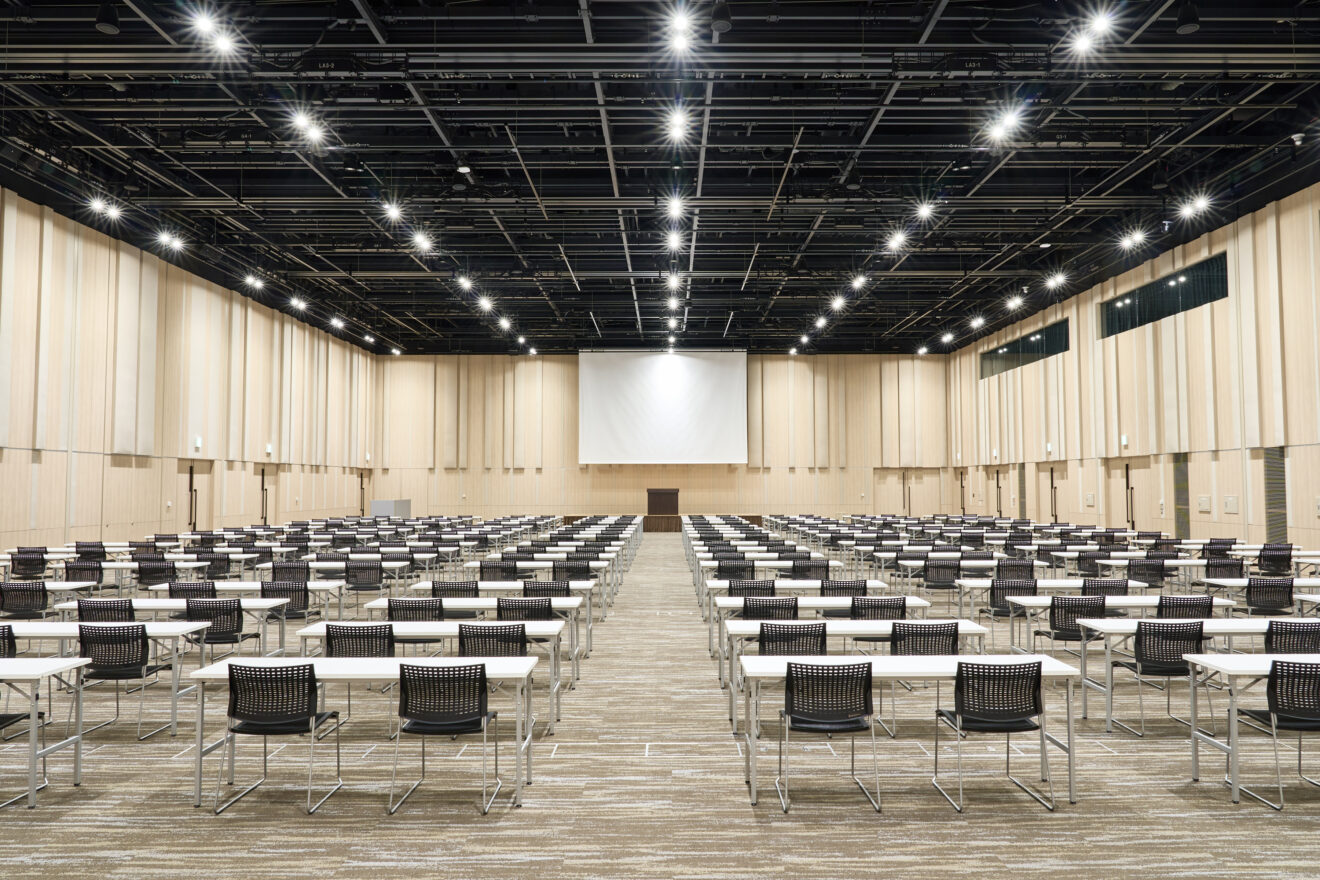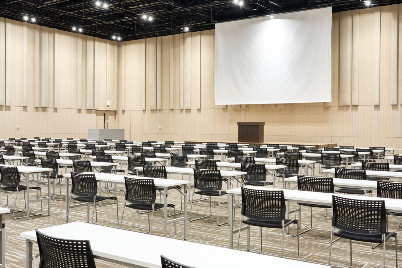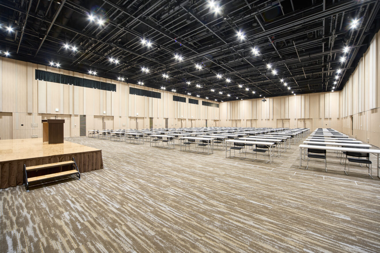 今回はゆったりとしたレイアウトですが、大ホールはスクール形式で最大660席、シアター形式で最大900席のご用意が可能です。
